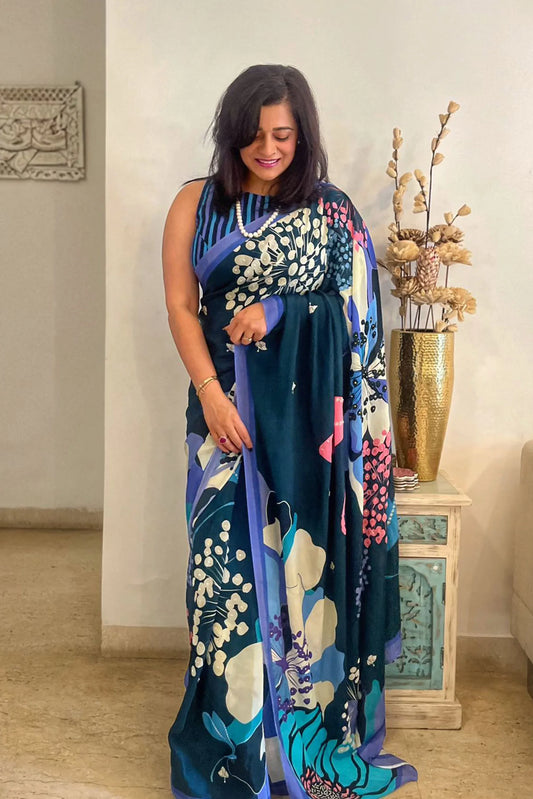 Midnight Blue Floral Printed & Embroidered Crepe Party Wear Saree