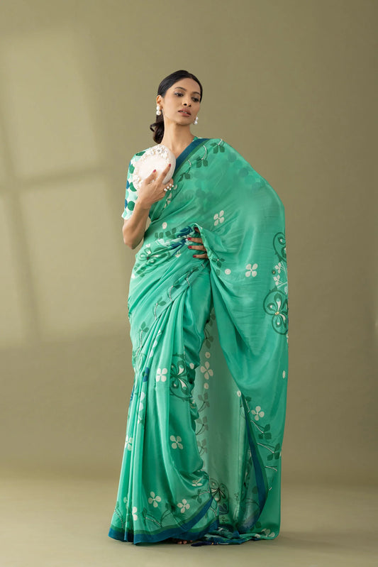 Sea Green Floral Printed & Embroidered Crepe Festive Saree