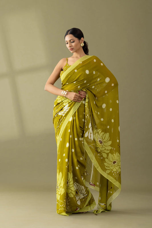 Heavenly Blooms Light Olive Printed & Embroidered Georgette Saree