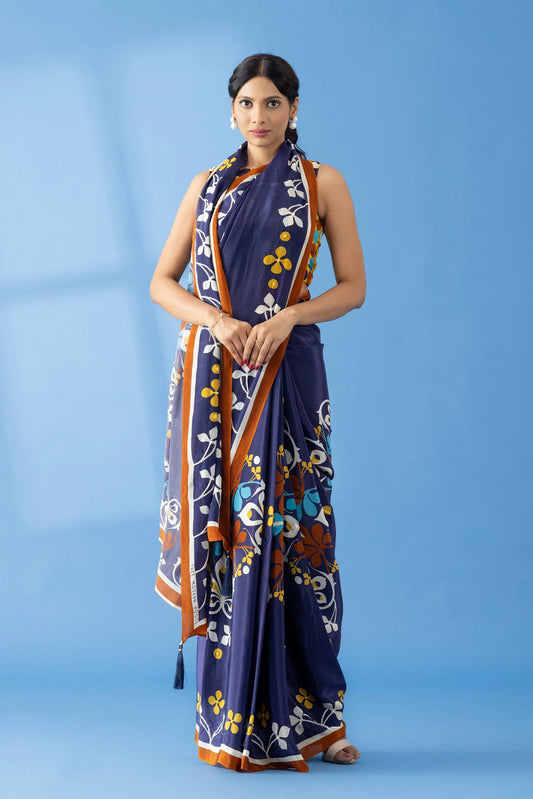Navy Floral Printed & Embroidered Crepe Festive Saree