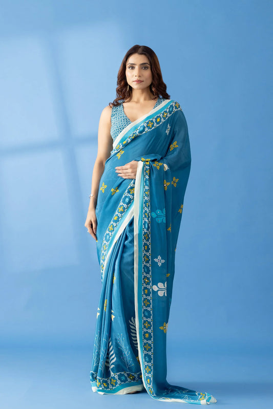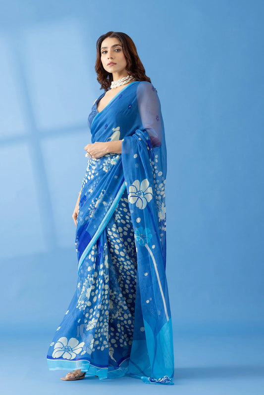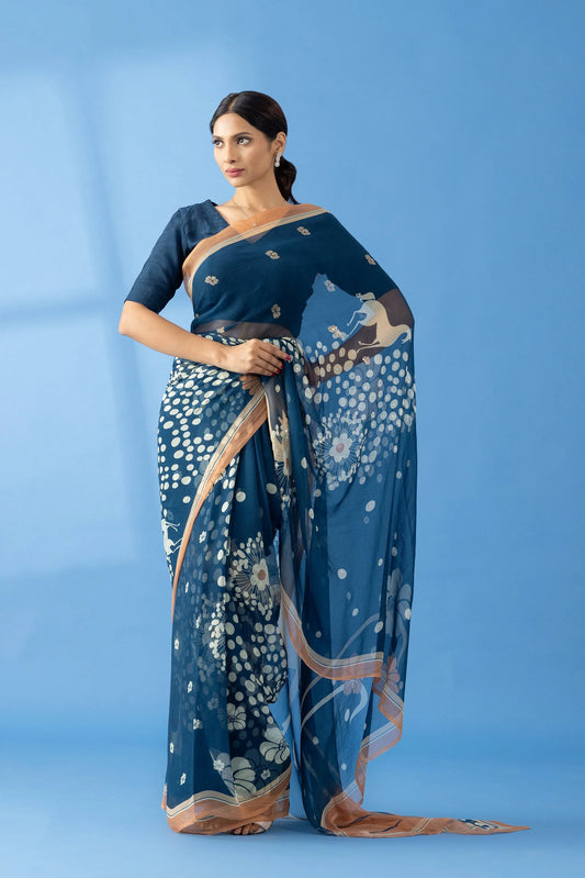 Timeless Garden Indigo Printed & Embroidered Georgette Saree