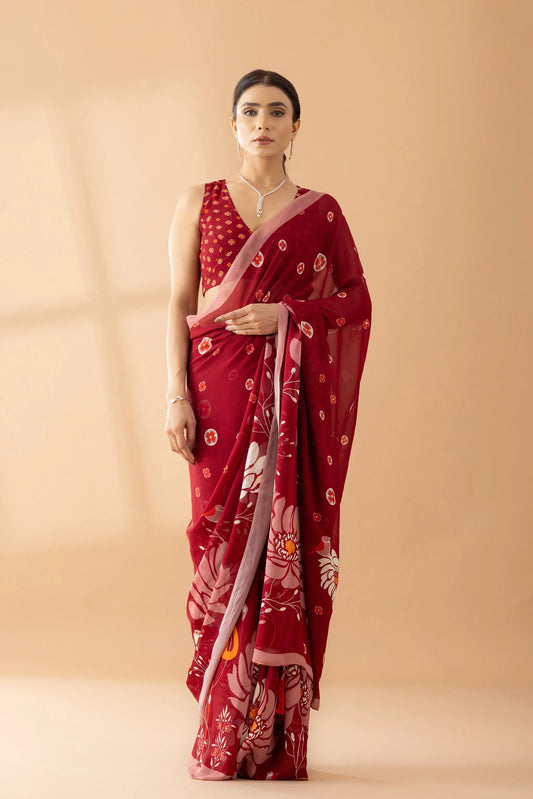 Heavenly Blooms Red Printed & Embroidered Georgette Saree