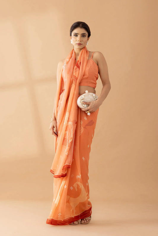 Whimsy Dreams Peach Fuzz Printed & Embroidered Chiffon Saree