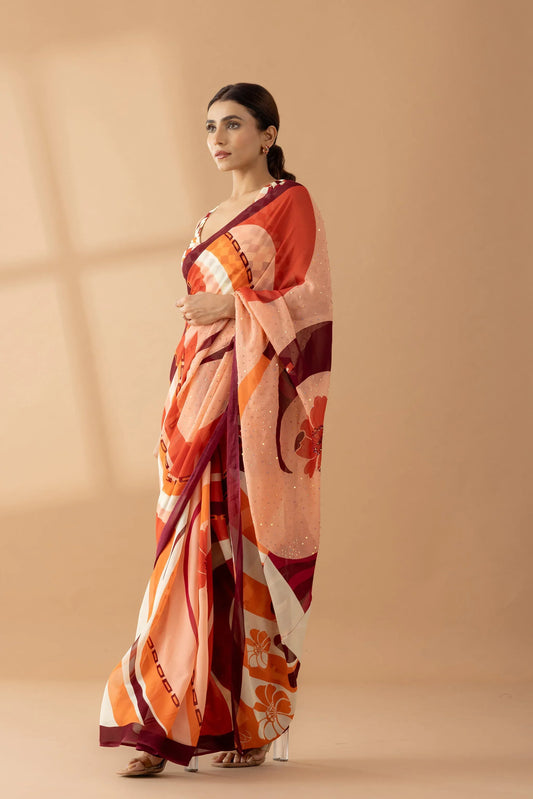 Whimsical Swirls Rust Printed & Embroidered Georgette Saree
