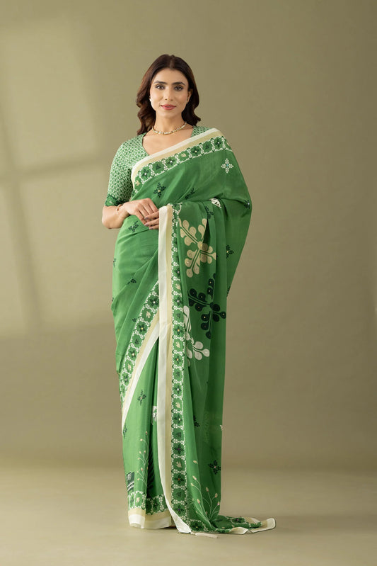 Graceful Charms Macha Green Printed & Embroidered Chiffon Saree