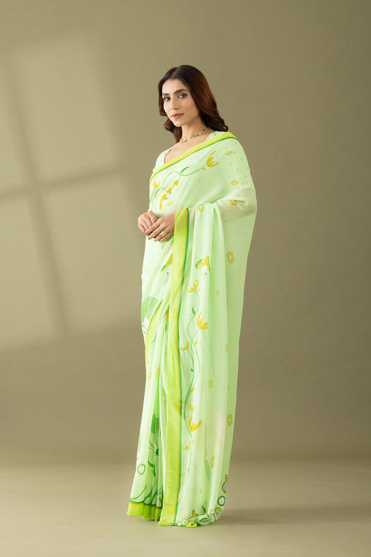 Timeless Garden Pastel Green Printed & Embroidered Georgette Saree