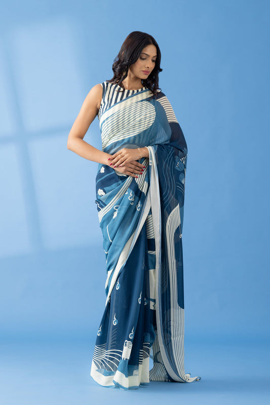 Majestic Peaks Sea Blue Printed Chiffon Saree