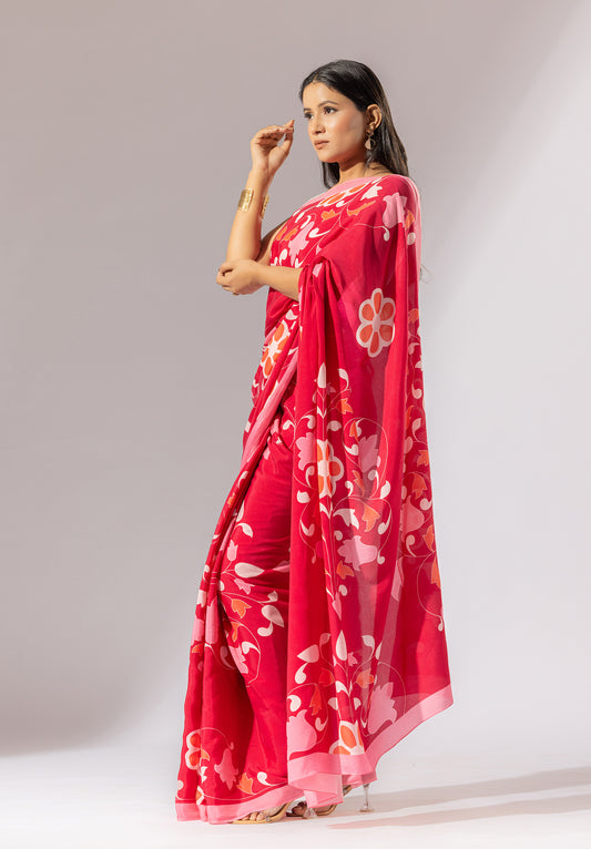 Heavenly Blooms Red Printed & Embroidered Georgette Saree