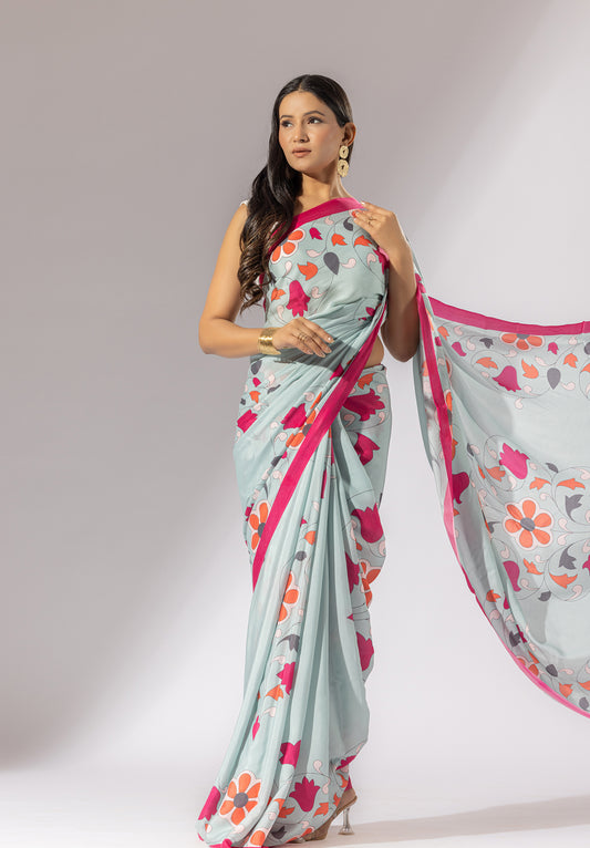 Graceful Charms Light Blue Printed & Embroidered Chiffon Saree