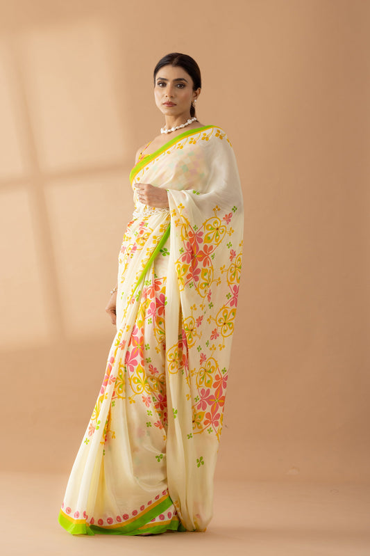 Kaleidoscope Garden Ivory Printed Georgette Saree