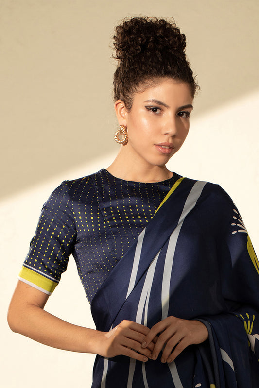 Midnight Blue Floral Printed & Embroidered Crepe Party Wear Saree