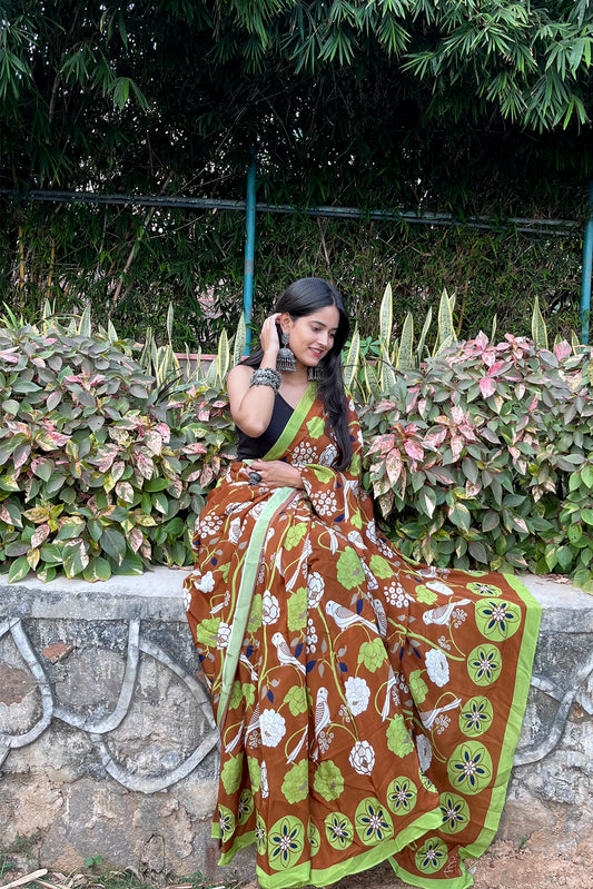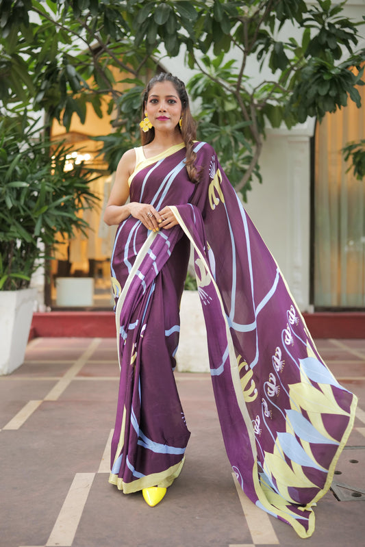 Ivory Lotus Floral Printed Crepe Designer Saree