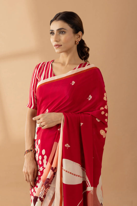 Crimson Red Floral Printed & Embroidered Crepe Party Wear Saree
