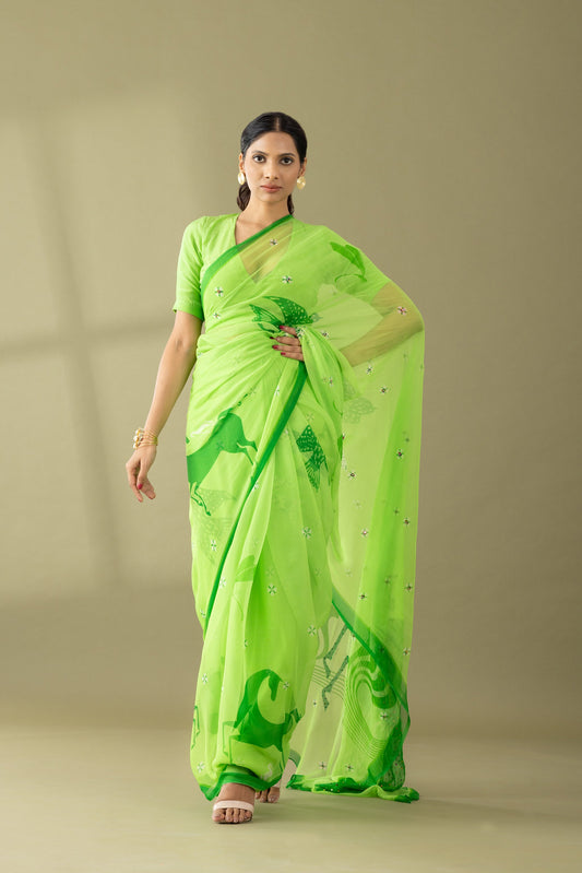 Graceful Charms Macha Green Printed & Embroidered Chiffon Saree