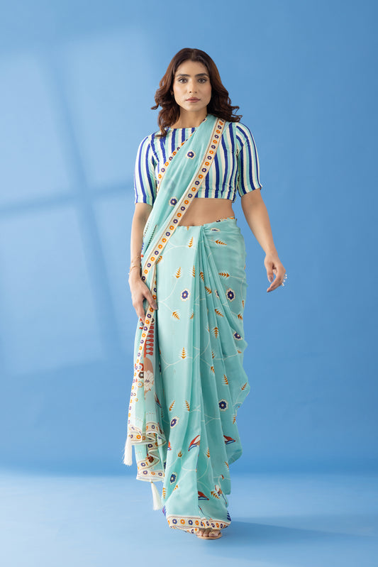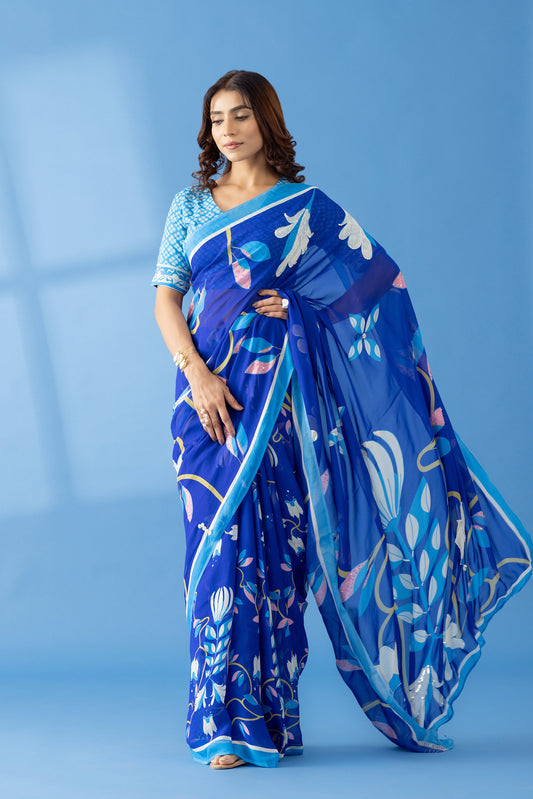 Timeless Garden Indigo Printed & Embroidered Georgette Saree