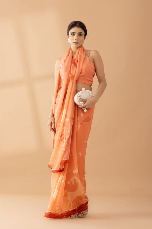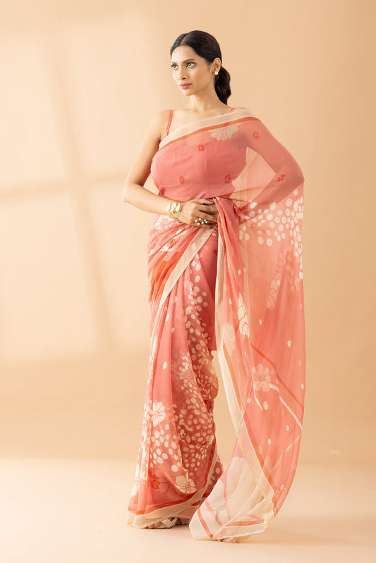 Whimsy Dreams Peach Fuzz Printed & Embroidered Chiffon Saree