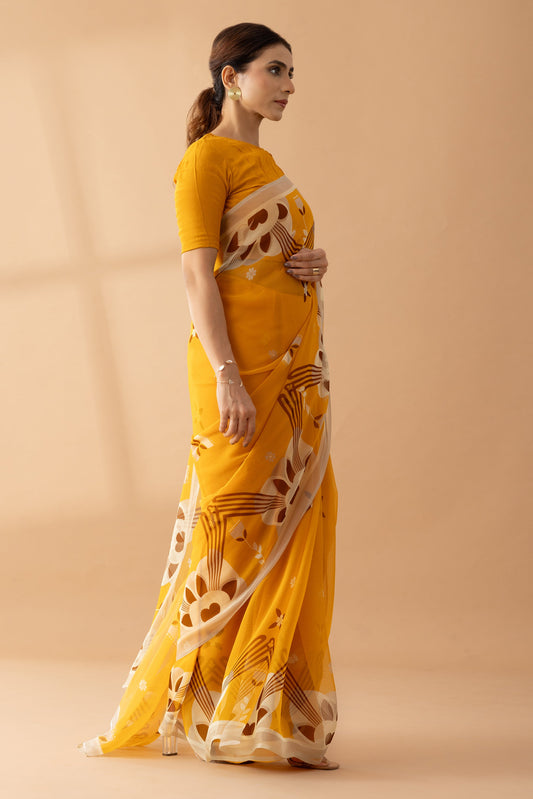 Majestic Peaks Mustard Printed Chiffon Saree