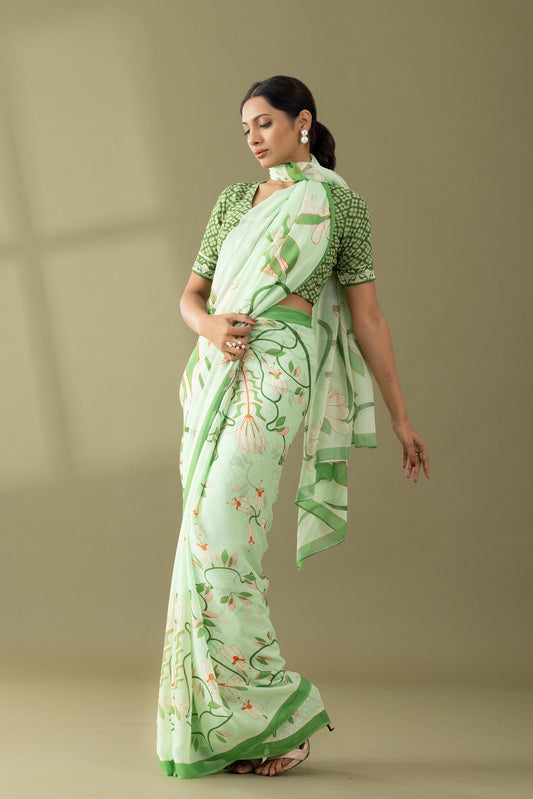 Timeless Garden Pastel Green Printed & Embroidered Georgette Saree