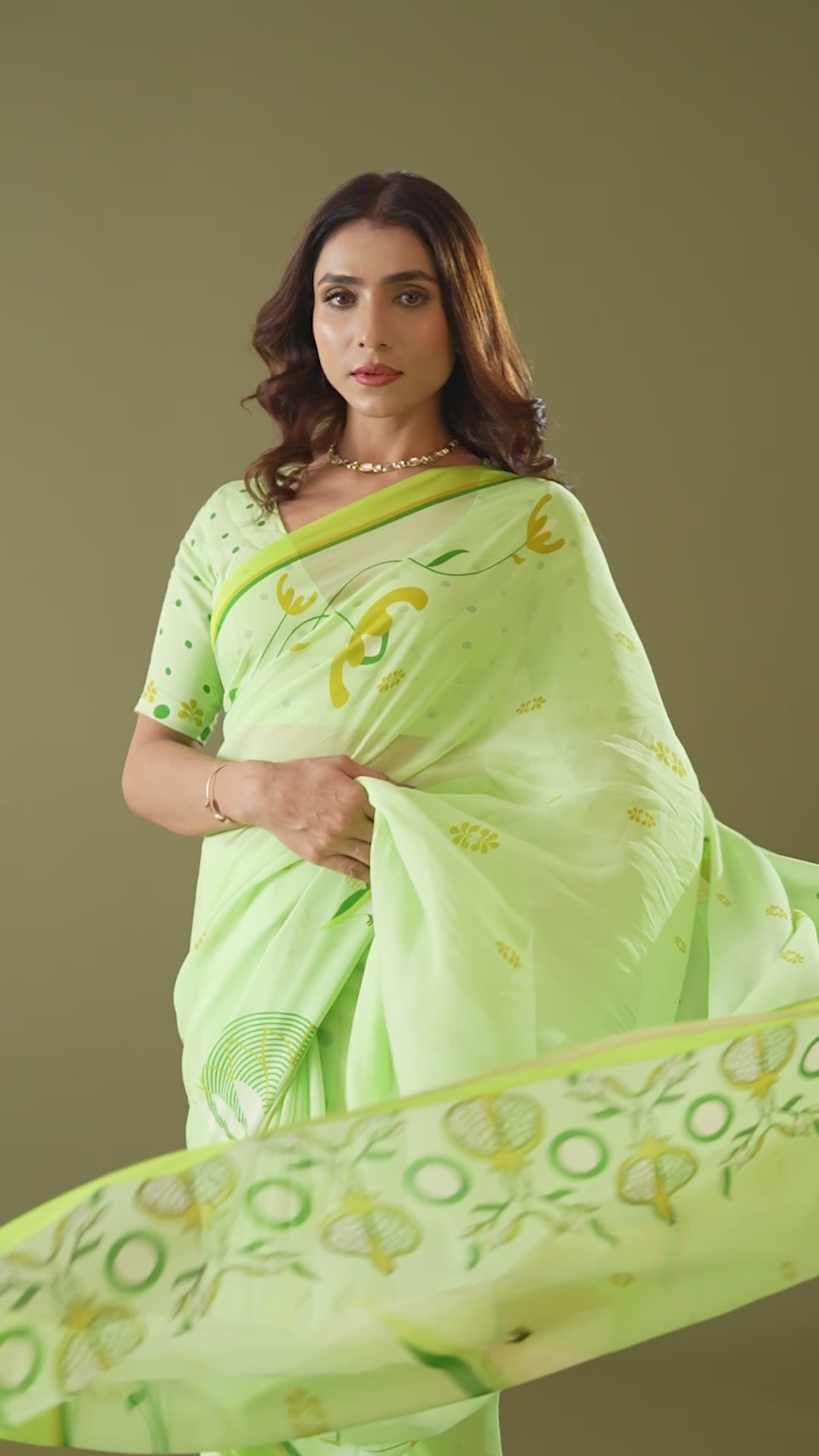 Light green georgette saree, featuring a serene print of dandelion flowers, reminiscent of peaceful summer fields and playful birds enjoying the gentle breeze.