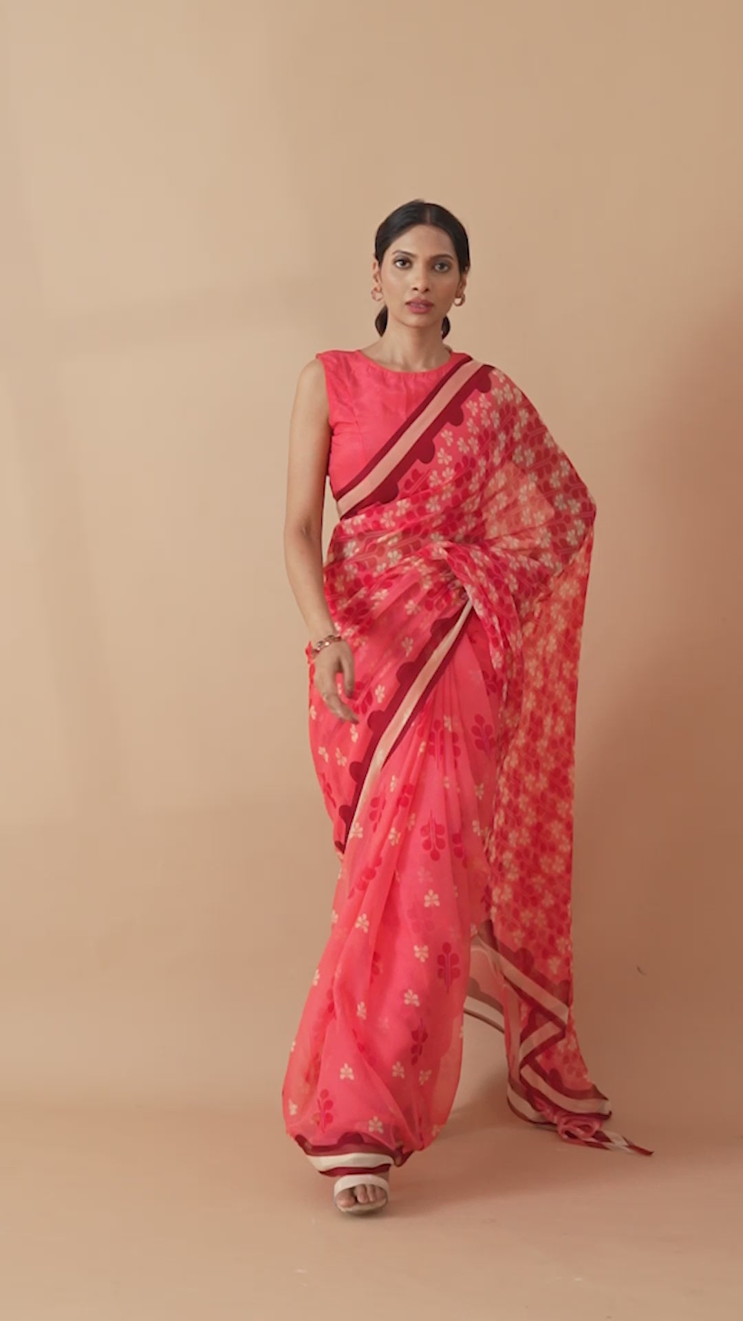 Watermelon Pink Petal Shower Printed Chiffon Saree